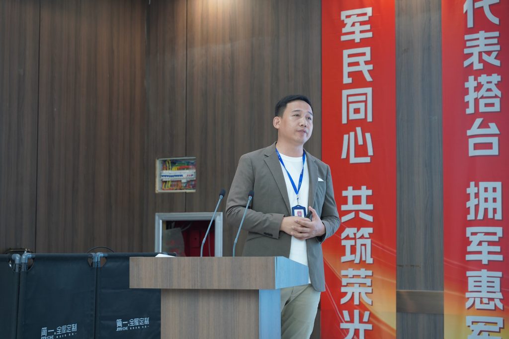 随后,简一家居董事长王艳霞女士发表致辞。她代表简一家居全体员工,向莅临现场的各位领导和退伍军人表示衷心的感谢和崇高的敬意。王艳霞董事长表示,简一家居作为一家高端定制家居企业,深知企业的成长离不开国家的稳定与和平,更离不开无数军人用热血和忠诚的守护。她强调,八一建军节是属于军人的节日,也是全社会向英雄致敬的节日。简一家居怀着这份敬意与感恩,在示范区政府的指导下,策划了本次政企联合公益活动,用实际行动回馈退伍军人,践行“拥军惠民、共筑温暖家园”的承诺。