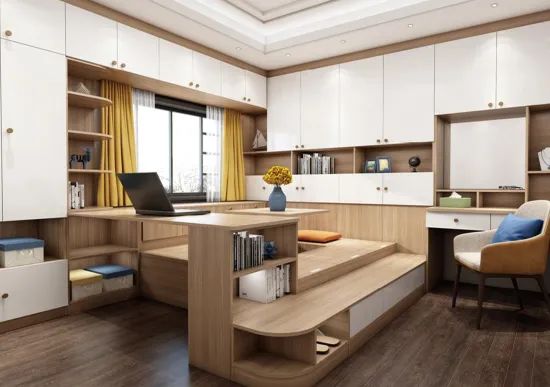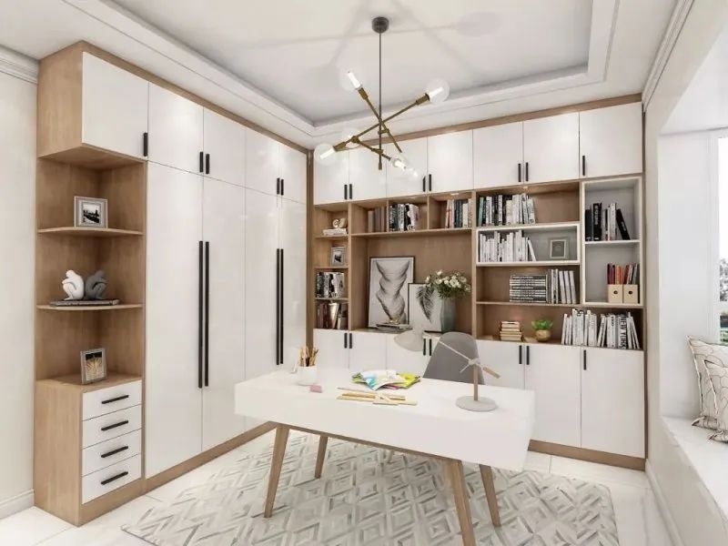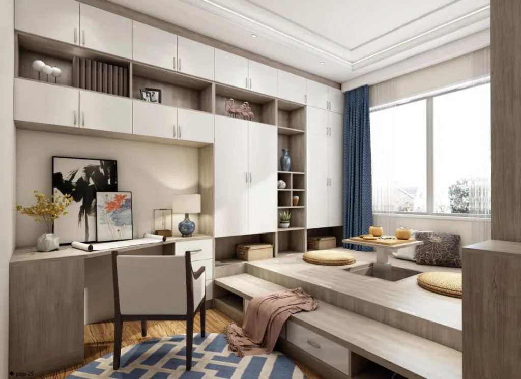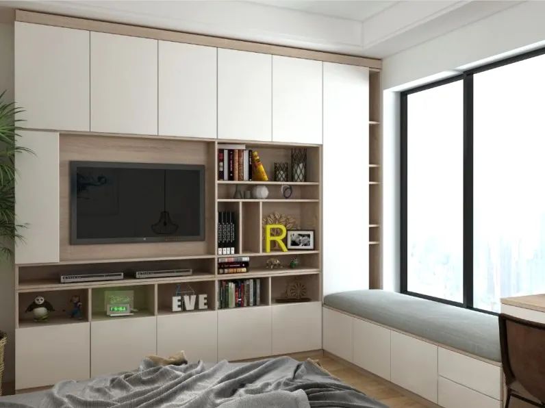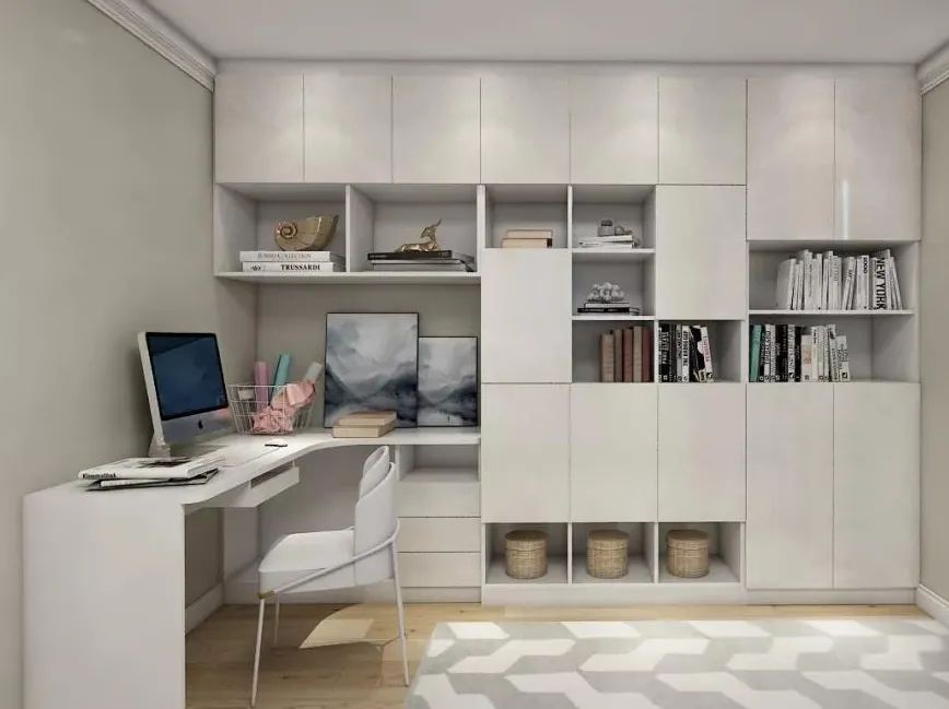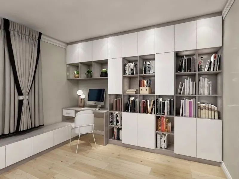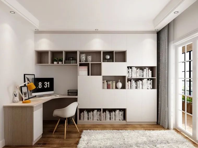 飘窗柜也可以做成简单的卡座、收纳,和书桌融为一体,整空间的柜子显得整体感很强,很有品位。