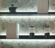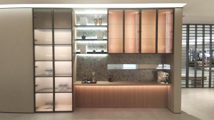 ▶︎ 材质:长虹玻璃、背光隔板、镂空铁艺、格栅柜门、镭射镜面…..多元化材质的完美融合;