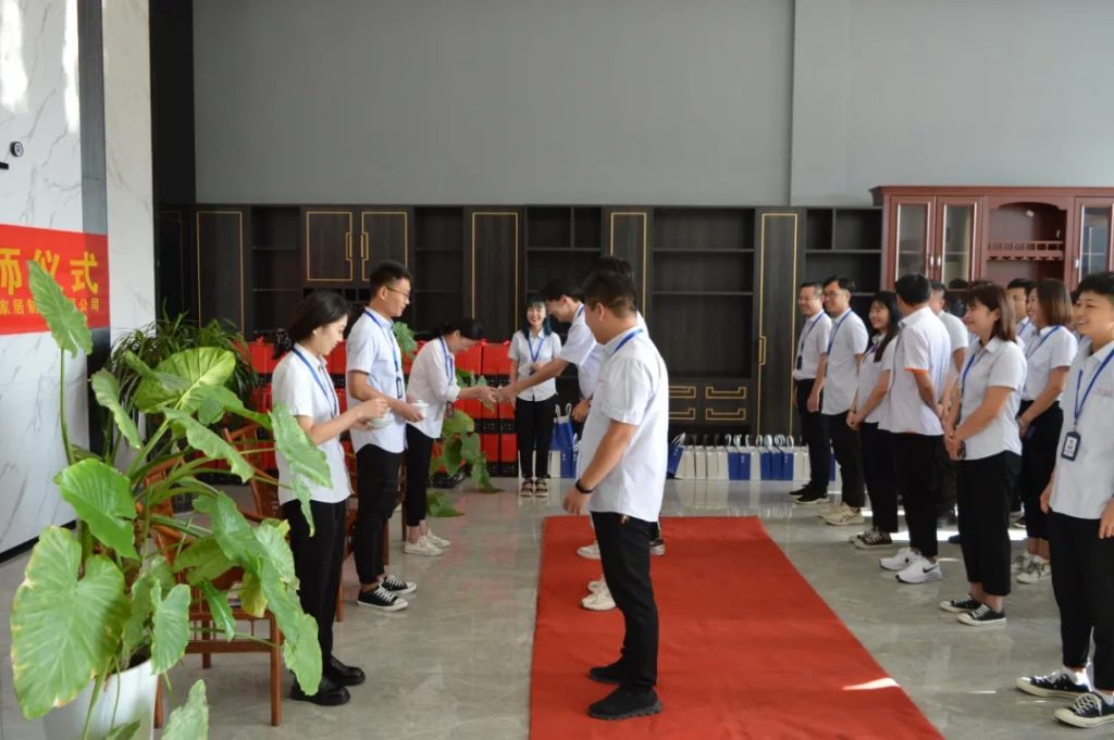 2020年8月21日,简一家人们迎来了一个不太一样的晨会,全体简一人在展示大厅一楼集合,今天的一楼大厅显得格外的庄重,因为今天在这里,简一家居第一期“设计师拜师仪式”要在这里举行。在李总例行点名之后,主持人齐齐上台来为我们介绍今天要进行拜师学艺的“徒弟”和他们的“师傅”们。
