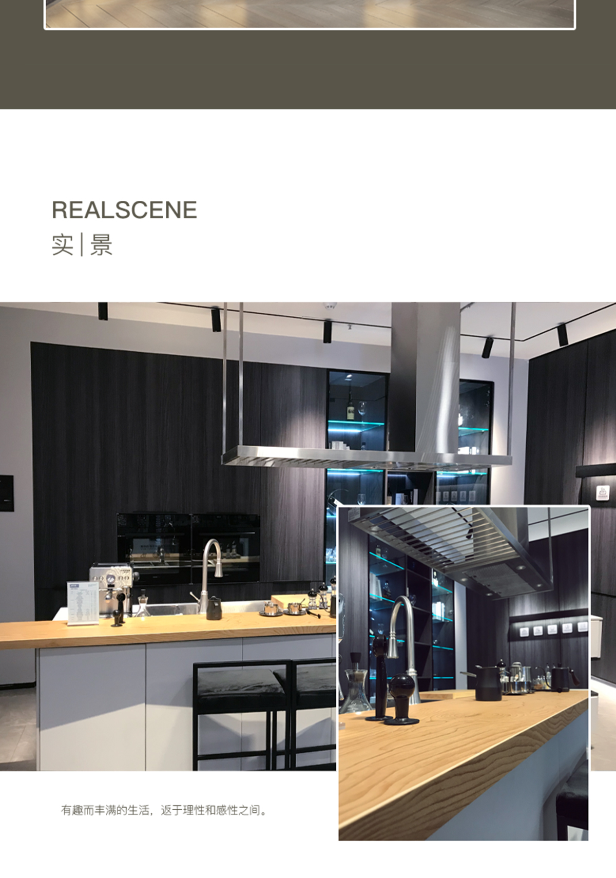 理念:有趣而丰满的生活,永远往返于理性和感性之间;元素:未来窗、集成灶、铁艺搁架、铝板格、亮光PET、岩板;格调:工业风、高冷范儿、时尚精致、未来感、品质、简约造型;