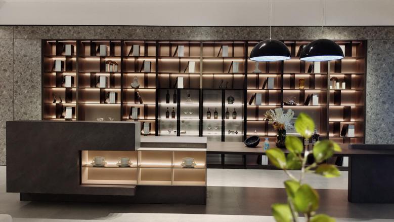 米兰系列的休闲餐厅采用矩阵组合、韵律节奏、解构主义和无界场景的设计理念。光影系统、铝板、超白玻璃、功能中岛等元素相互交融,营造了一个令人印象深刻的餐厅。展示柜采用矩阵式结构排列,强调韵律感,而中岛则采用结构主义的设计手法,错落有致。这个空间集合了书柜、酒柜、收藏品展示于一体,成为了亲朋好友交流互动的社交中心。石纹板、木纹柜体、铝板和超白玻璃的完美融合,为这个餐厅带来了更多的质感。这里是一个新时代的社交空间,是与闺蜜一起享用美食、下午茶,聊天交流的理想场所。