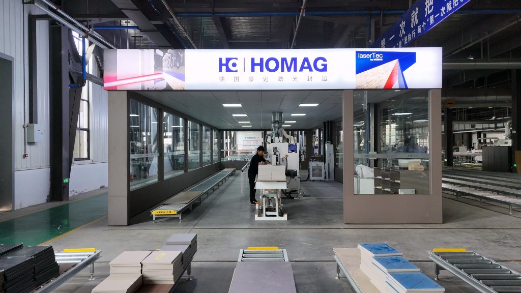 除了激光封边机,简一家居还配备了210封边机连线、210回转线,这些设备整体采用钢材料,稳定而耐用,标配精准送带功能,节省封边带材料,四马达跟踪单元,效率高且容易调节。同时,豪迈PTP160加工中心凭借其打孔、开槽与铣欣多功能于一身的特点,可选择双工位或者四工位交替作业,灵活的加工模式显著提高了加工效率,满足了多种场景下的打孔需求。