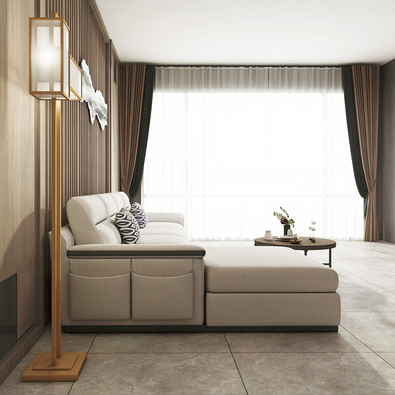 科技布和进口高弹9.5公分加宽橡筋,沙发现用实木腿,靠背是羽绒。